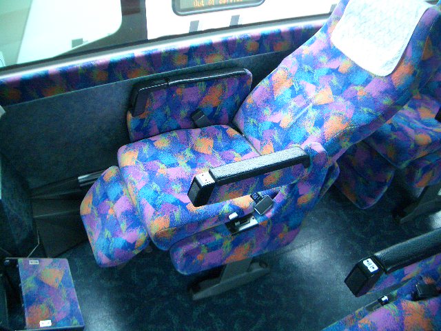 | 逆に一番居心地の悪い席は、最前列中央席です。 左右共に他のお客さんがいるし、 やはり出入り口に近い為、リラックスできません。 小物入れや読書灯が付いた板が足元を一層狭くしています。 改札時に空席があれば他の席を勧めるくらい、 運転士から見てもかわいそうな座席なのです。 (写真座席 1B) |