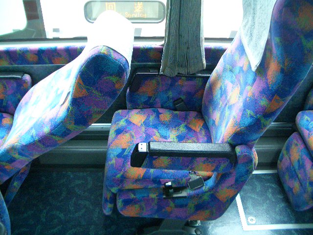 | 足置き、フットレストに座席を一番リクライニングしてみました。 運転士が神経使って高速道路を走っている中、 お客さんはこんなにリラックスして乗車しているんですね。 靴を脱ぐだけでも、足の疲れ方は違うものです。 |