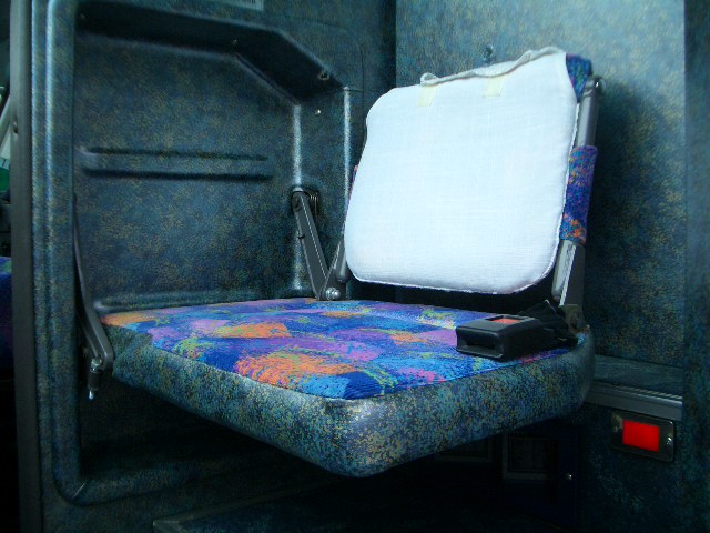 | <番外編> ガイド席の座席です。 2マン運行時に、控えの運転士が座っています。 ご覧の通りクッションの薄いこと!(笑) 長時間座っていると腰が痛くなります。 ガイド席で休んでいるより、クッションの良い運転席で運転してた方がマシかも?! |