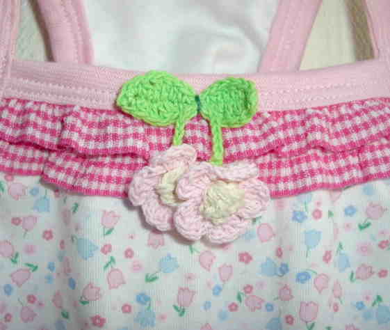 小さなチューリップ柄の生地にチェックのゴムレースを付け、ピンクのお花を